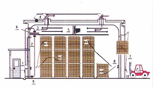 頂風(fēng)機(jī)型干燥窯屬周期式強(qiáng)制循環(huán)干燥窯,風(fēng)機(jī)置于干燥窯頂部,采用耐高溫、高濕電機(jī)和防腐鋁壓鑄葉輪組裝在風(fēng)機(jī)架上,并按氣流方向分為正壓區(qū)和負(fù)壓區(qū)。風(fēng)機(jī)可正逆定時(shí)換向旋轉(zhuǎn),氣流隨之改變循環(huán)方向,以此實(shí)現(xiàn)了通過(guò)材堆的氣流分布均勻而獲得很好的干燥質(zhì)量。